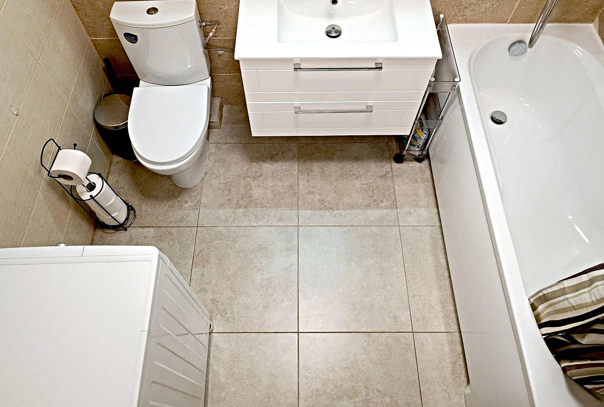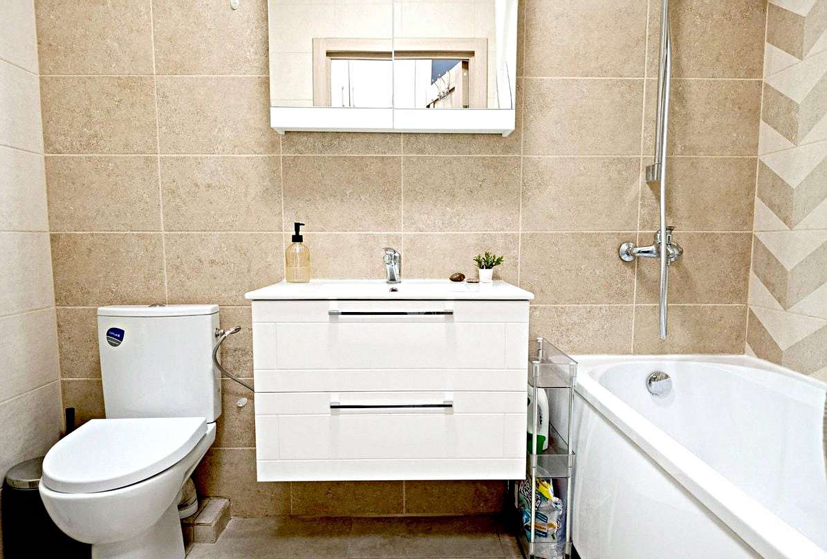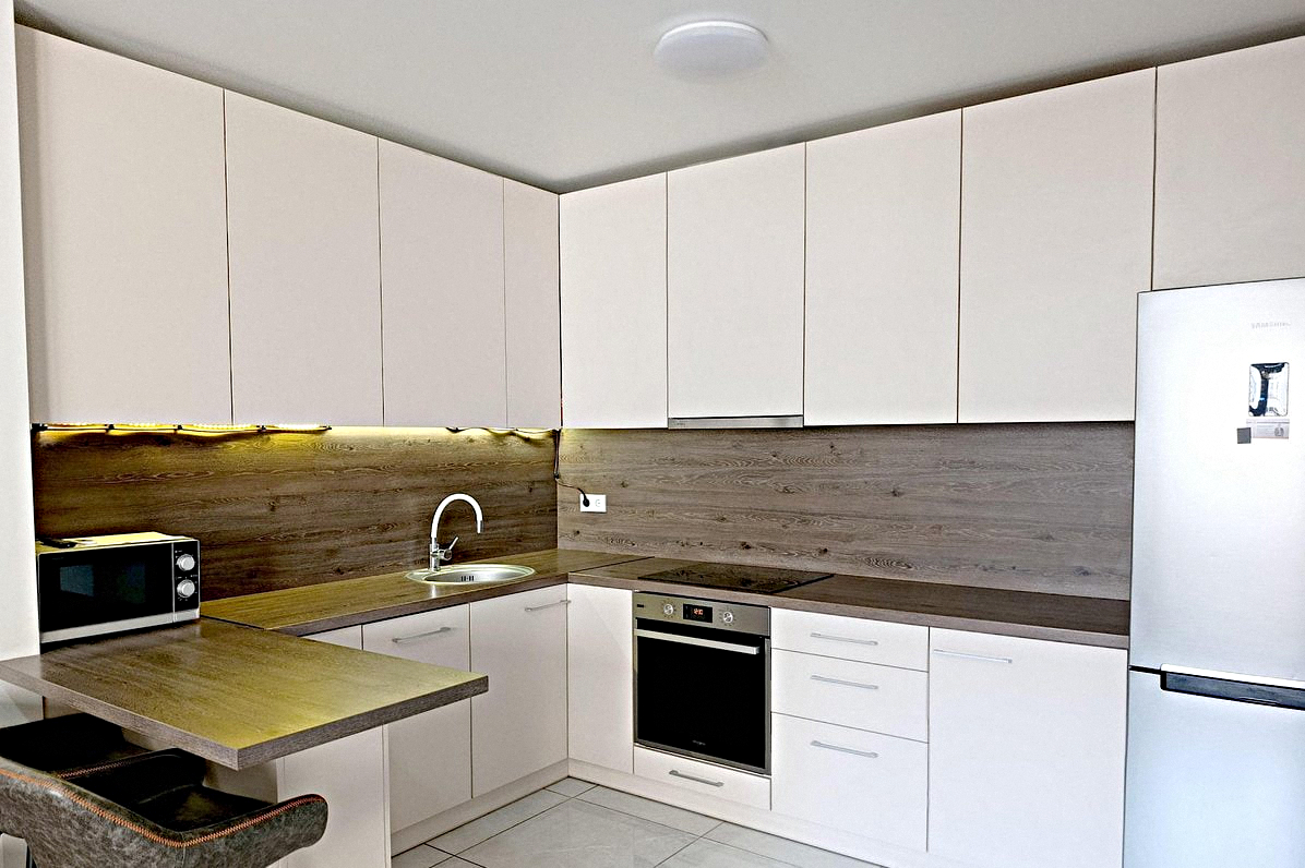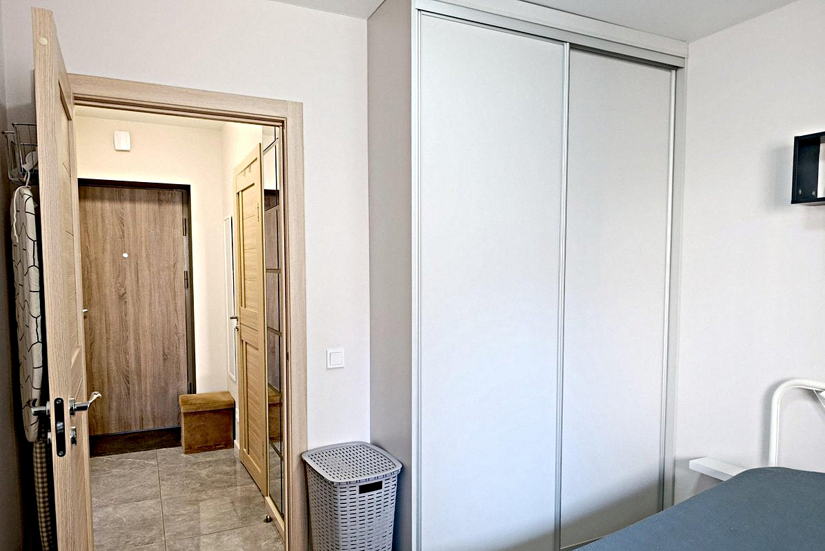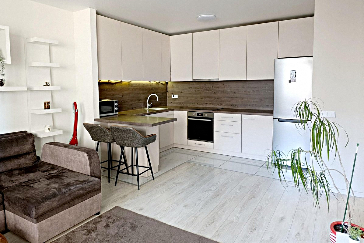 The kitchen is combined with the living room: This stylish room features all the necessary appliances, kitchen utensils, a dining table, air conditioning, a fold-out double sofa bed, and a Smart TV.