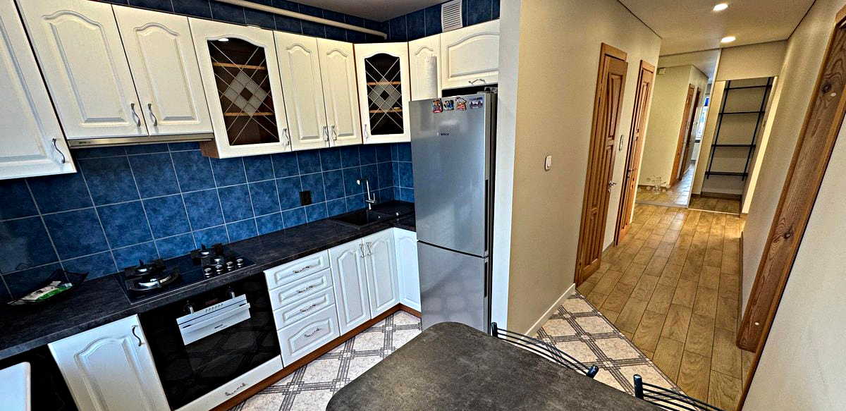 Kitchen: Sunny room with all necessary appliances, kitchen utensils, and a dining table.