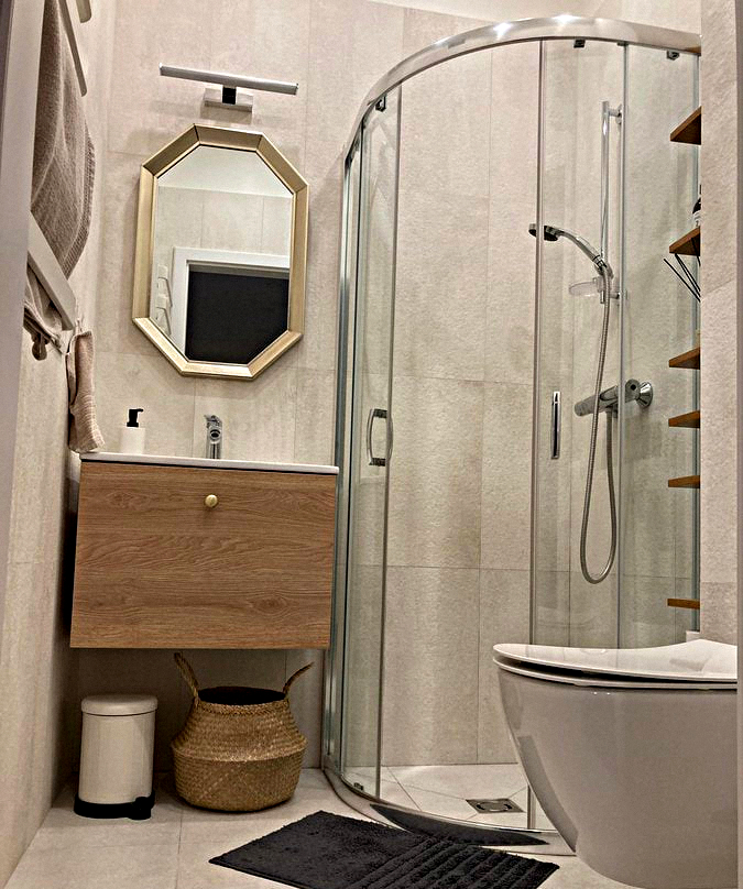 Bathroom: Shower stall, sink with mirror, washing machine, and toilet.