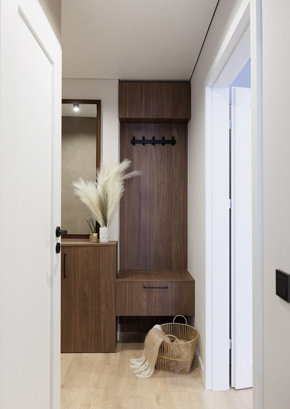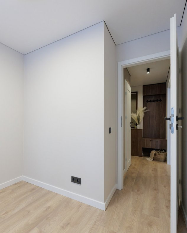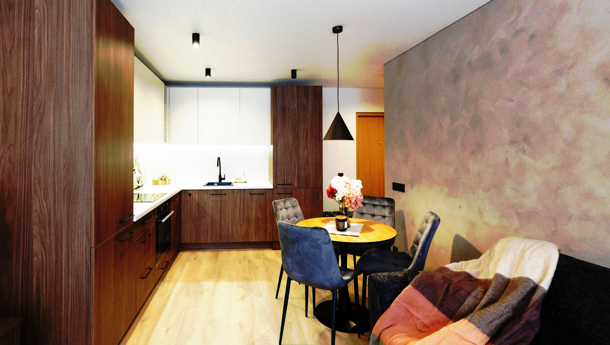 Living room combined with kitchen: Spacious room with all necessary appliances, kitchen utensils, a small fold-out sofa, and a dining table.
