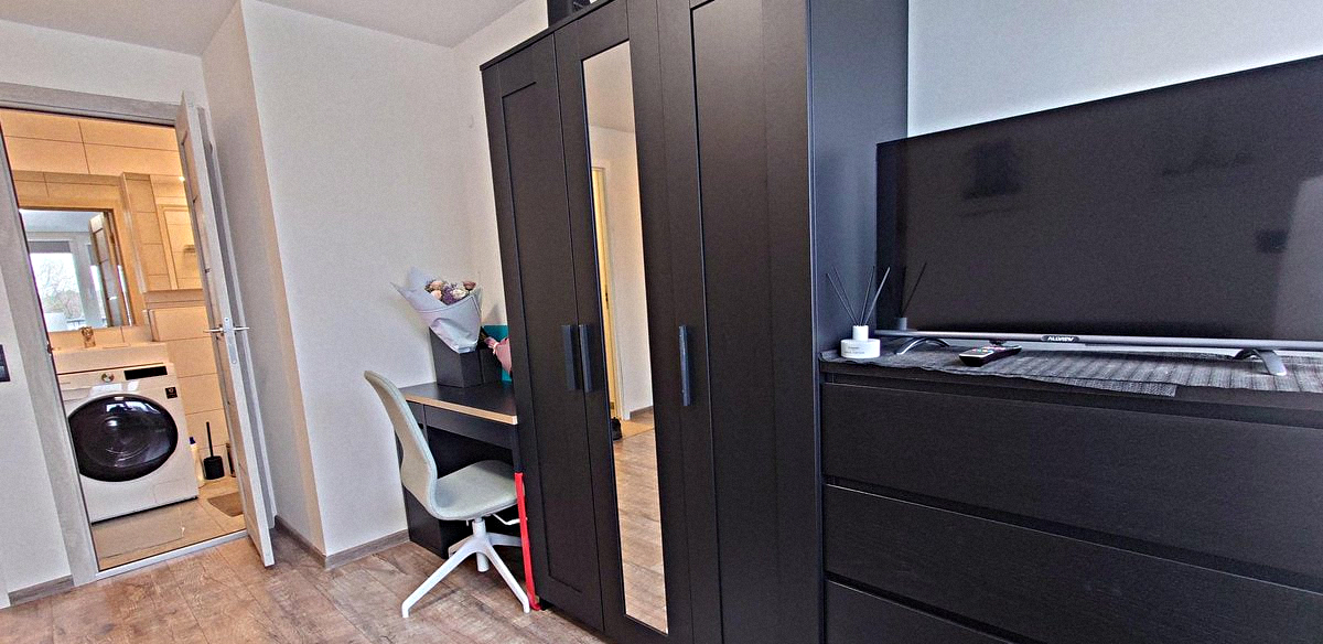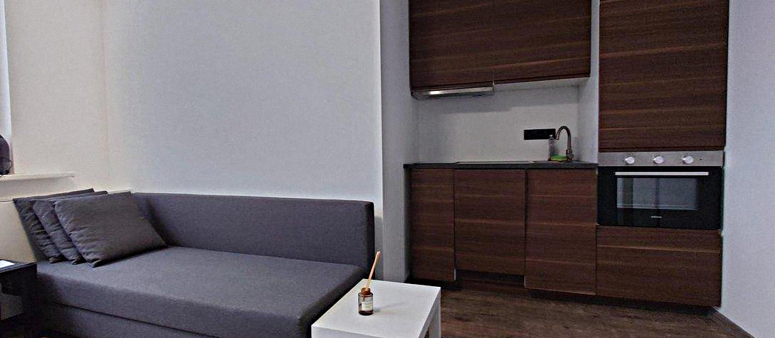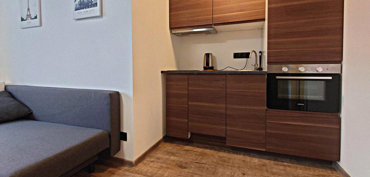 The bedroom is combined with the kitchen. This warm room features a double sofa bed, a desk, a mirrored wardrobe, a Smart TV, and all necessary appliances and kitchen utensils.