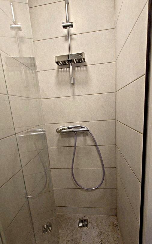 Bathroom: A shower stall, a vanity with a mirror, a washing machine, and a toilet.
